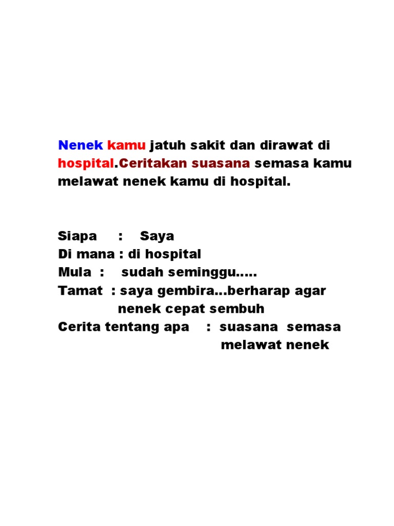 Menjual pasar malam banyak duit - menyimpan - bank Penutup LATIHAN 27 Ceritakan pengalaman kamu ketika melawat pesakit di hospital. Jadi tidaklah begitu boring kalau terpaksa duduk di wad lama lama. Saya mungkin berada di kampung selama beberapa hari dengan mengikut sahaja keputusan ibu bapa saya selagi mereka berasa perlu untuk berada di sana.