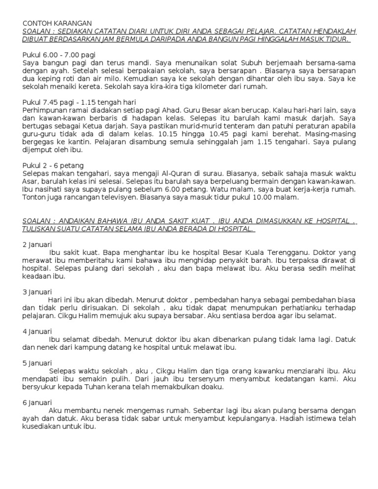 Perhatikan soalan di bawah ini. Mengandungi contoh-contoh karangan dalam Bahasa Malaysia dan Bahasa Inggeris. Tuliskan catatan selama ibu anda berada di hospital.